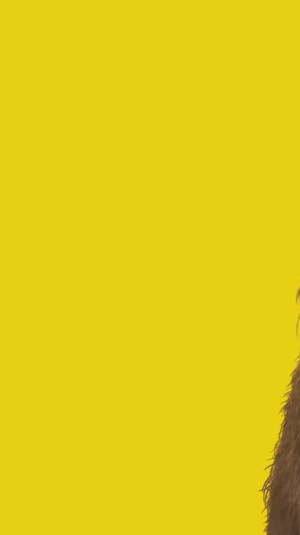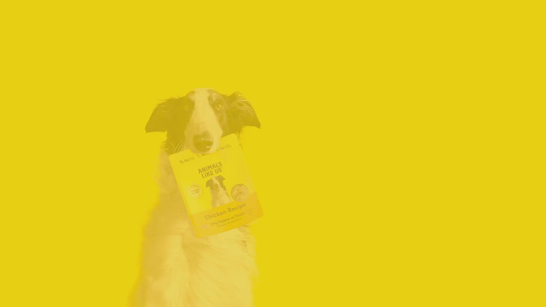 Dog with a bag of 'Animals Like Us' beef recipe dog food on a yellow background